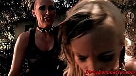 Classy lezdom dildoing with babes outdoors