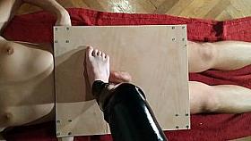 Dominatrix tramples her slave'_s little dick with pointed toe shoes.