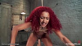 Teen enduring submissive sex in dungeon and is made to cum with a sex toy