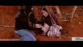 Rough ass to mouth and ass to throat with 2 submissive girls in bondage and a huge didlo - a hard anal domination session in the dirty with big-ass Rebel Rhyder and her petite cuck Brooke Johnson for Domthenation