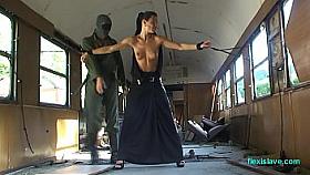 Bdsm model Alex Zothberg nude, oiled, and whipped in train